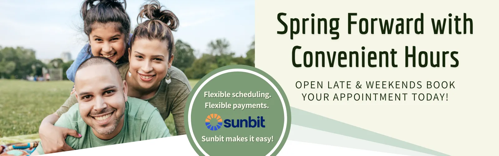 Spring Forward with Convenient Hours: Open late and weekends —book your appointment today! Flexible scheduling. Flexible payments. Sunbit makes it easy.